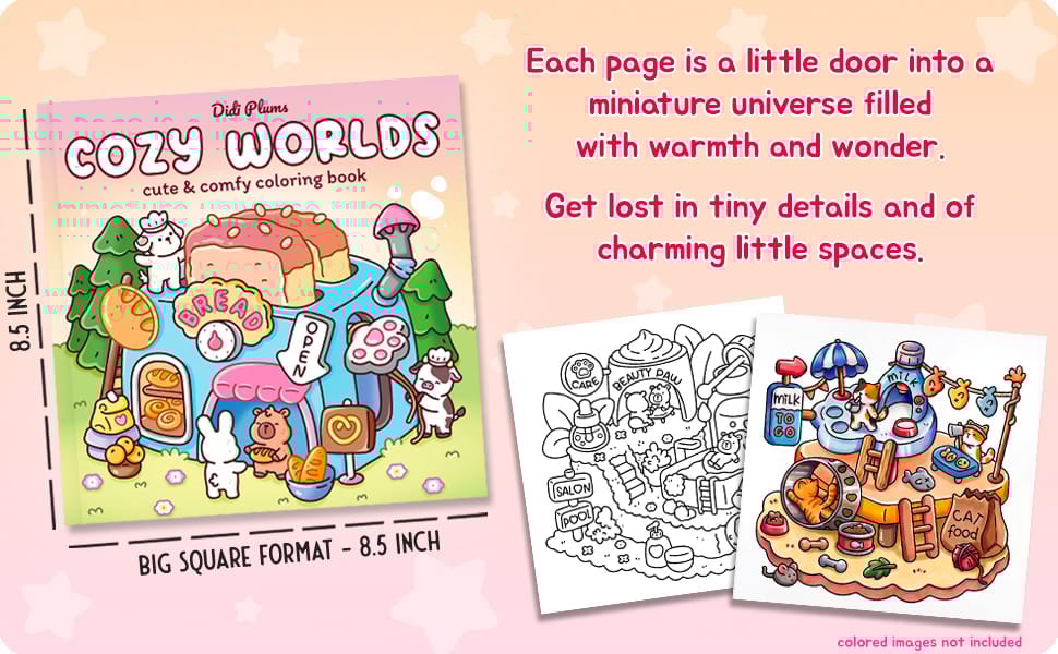 I’m so happy to introduce my newest coloring book, Cozy Worlds.